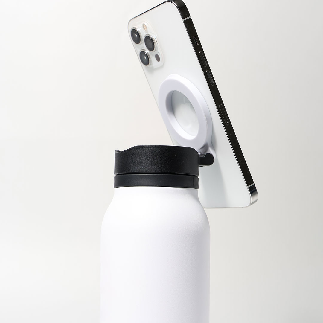 Your 900ml Drink Buddy on the go. Quench your thirst and use the bottle as your mobile stand anywhere you will be. The magnetic phone loop and its portability is very usable. With wide opening for easy cleaning and ice compatibility. Product Size: 25.35×8.45cm Diameter. Packaging: Paper box