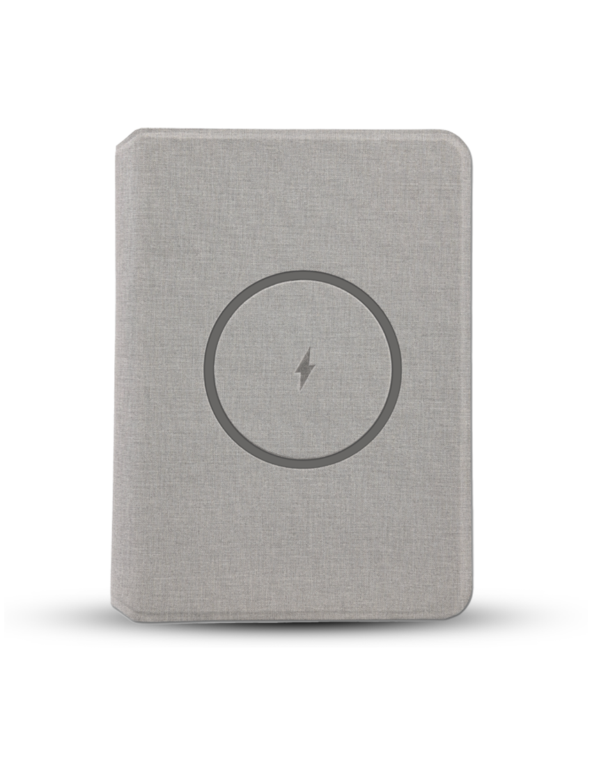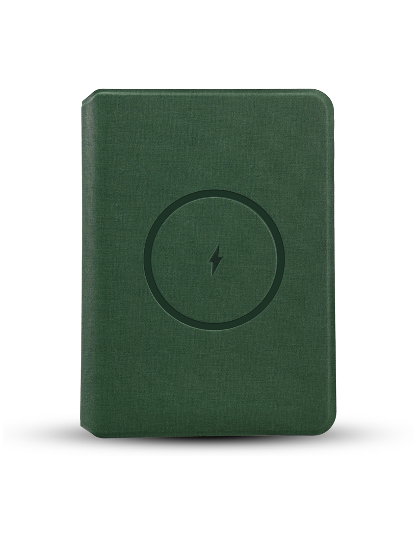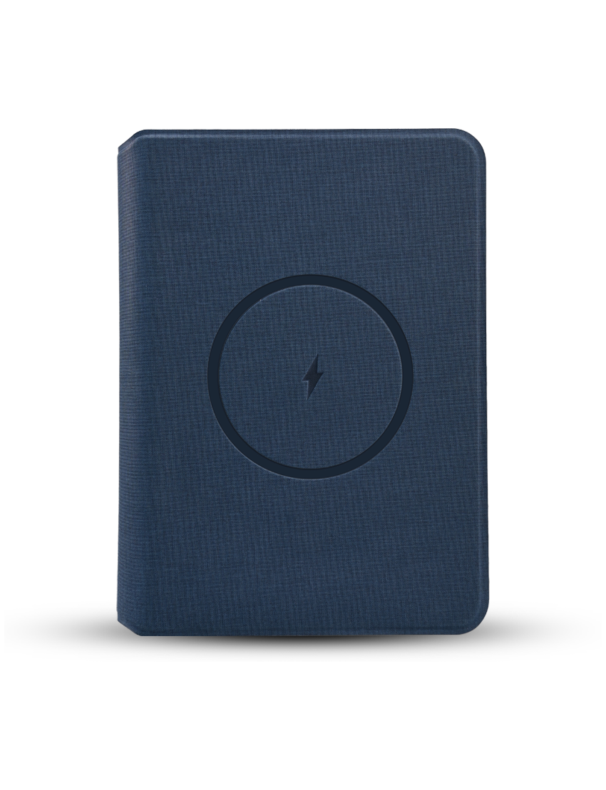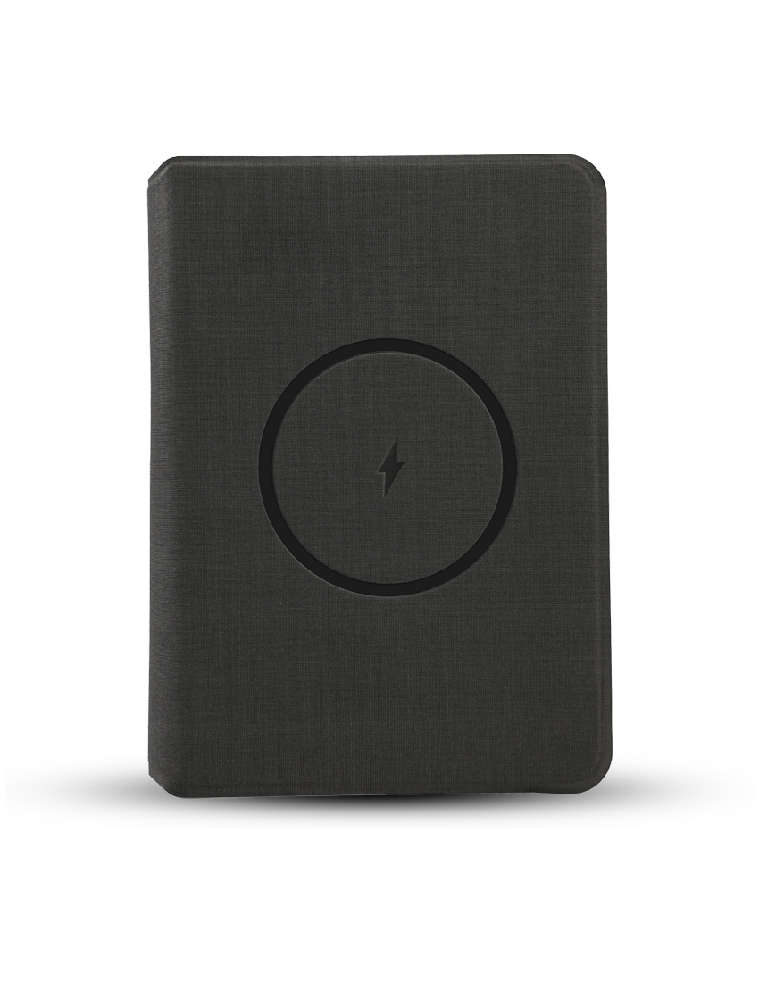 POWER NOTE, a multifunctional notebook combining premium organization and wireless charging. Featuring a 5W wireless charger and a 5000mAh powerbank integrated into its spine, this notebook keeps your devices powered while offering 64 sheets of paper for notes, sketches, or plans.