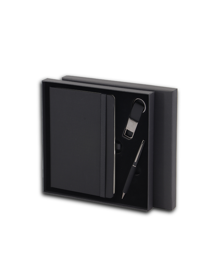 PRIME SET, the perfect gift for any occasion! This sophisticated set features a beautifully crafted A5 notebook made from special PU material, containing 96 sheets of 70g ruled ivory paper for a smooth writing experience. The notebook includes a convenient pen loop to keep your writing instrument handy at all times.Accompanying the notebook is a sleek metal pen with a PU cover on the barrel and an eye-catching spray paint finish on the clip side, ensuring both style and functionality. Additionally, the set includes a stylish keychain made from PU material, featuring an electroplated gunmetal holder that adds a touch of elegance.All components are elegantly packaged in a matching color hard paper box, making the PRIME SET an ideal gift for colleagues, friends, or loved ones. With dimensions of 24 x 24 x 2.5 cm, this set is perfectly sized for easy gifting and storage.